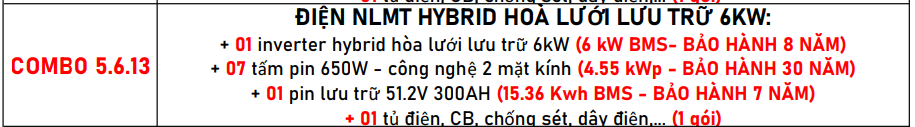 COMBO 5.6.13: (Số lượng điện: 546 kwh ~ Tiền điện: 1,651,106 đồng)/ 1 tháng | 01 pin lưu trữ 15.36 Kwh