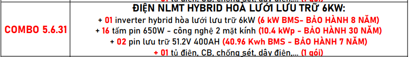 COMBO 5.6.6: (Số lượng điện: 702 kwh ~ Tiền điện: 2,215,413 đồng)/ 1 tháng | 01 pin lưu trữ 5.12 Kwh